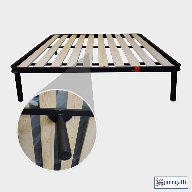 Rete matrimoniale con 10 tavoloni verticali in abete da 18 mm di spessore. Super rinforzata con telaio perimetrale in tubo rettangolo 50 X 25 mm su cui sono inserite i tavoloni. Tre traverse di rinforzo orizzontali e 5 piedi. Verniciatura a forno con polvere epossipoliestere atossica colore nero. Imballo con termoretraibile e cartone;